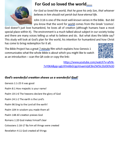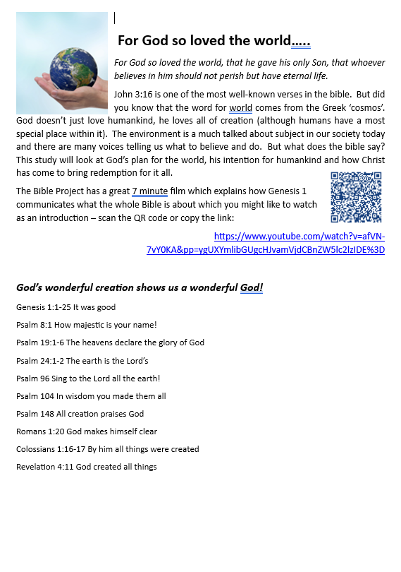 For God so loved the world, that he gave his only Son, that whoever believes in him should not perish but have eternal life. John 3:16 is one of the most well-known verses in the bible. But did you know that the word for world comes from the Greek ‘cosmos’. God doesn’t just love humankind, he loves all of creation (although humans have a most special place within it). The environment is a much talked about subject in our society today and there are many voices telling us what to believe and do. But what does the bible say? This study will look at God’s plan for the world, his intention for humankind and how Christ